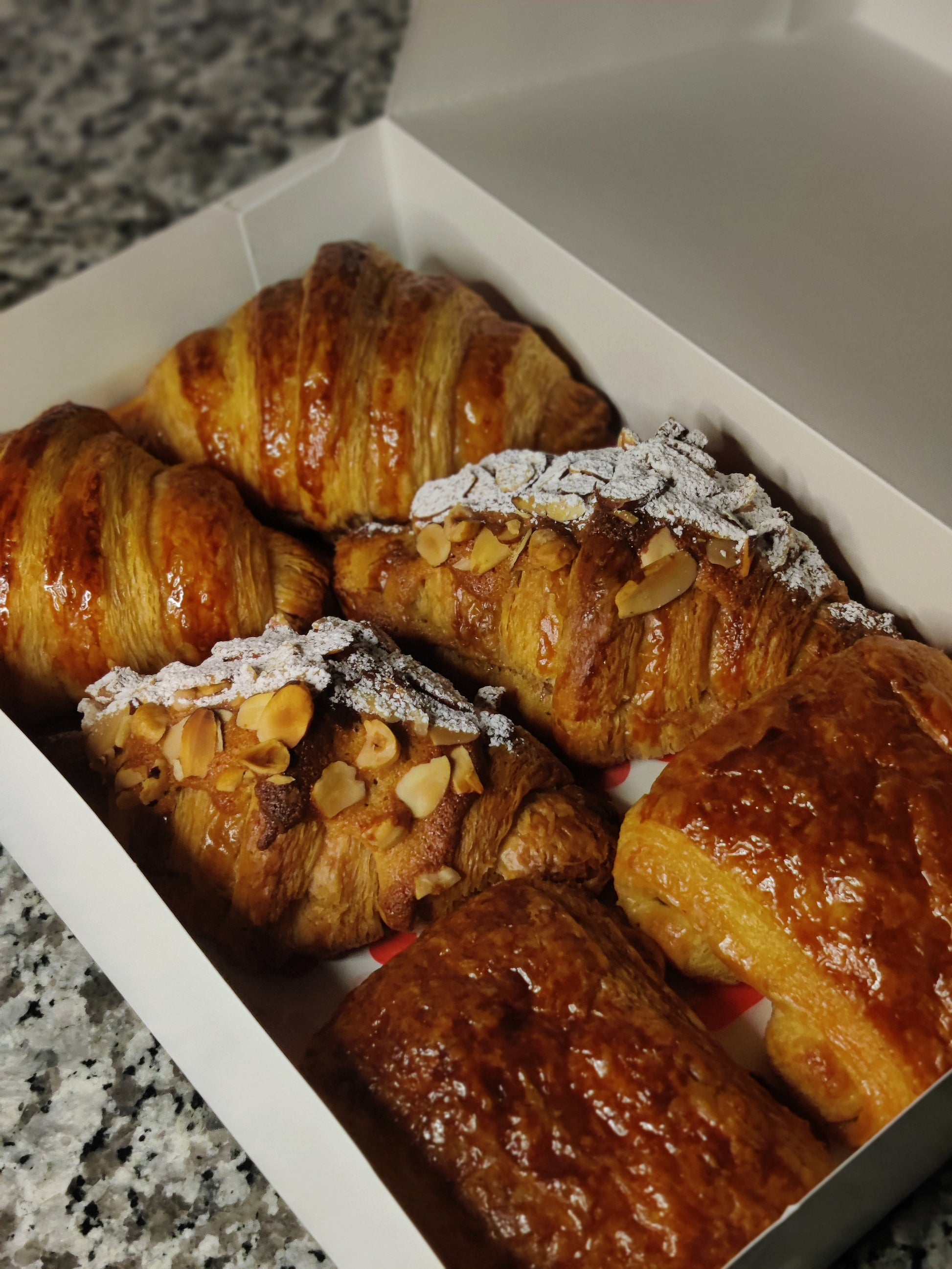 This assortment includes two signature plain croissants, two pains au chocolat, and two almond croissants